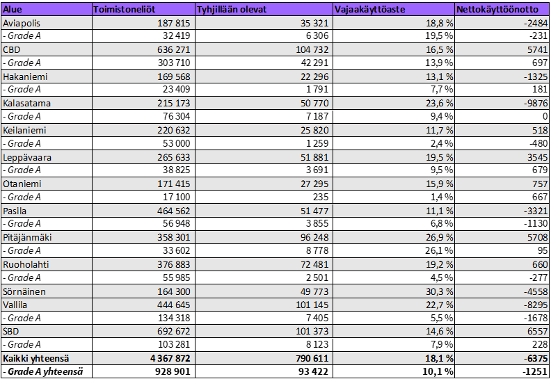 Pääkaupunkiseudun keskeisillä toimistoalueilla oli maaliskuun 2026 lopussa tyhjää toimistotilaa 791 000 neliömetriä. Keskimääräinen vajaakäyttöaste oli 18,1 prosenttia. Vajaakäyttö väheni eniten Pitäjänmäellä ja nousi Kalasatamassa. Grade A -toimistojen keskimääräinen vajaakäyttöaste on noin 10,1 prosenttia.